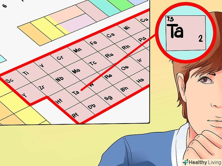 Знайдіть елемент у групах з 3 по 12. У цих групах розташовані перехідні метали. У цьому підрозділі ми розповімо, як визначити число валентних електронів в атомах таких елементів. Зауважте, що в деяких елементах число валентних електронів визначити не можна.- Наприклад, розглянемо тантал( Ta); його атомний номер 73. Далі ми знайдемо число його валентних електронів (або, принаймні, спробуємо це зробити).