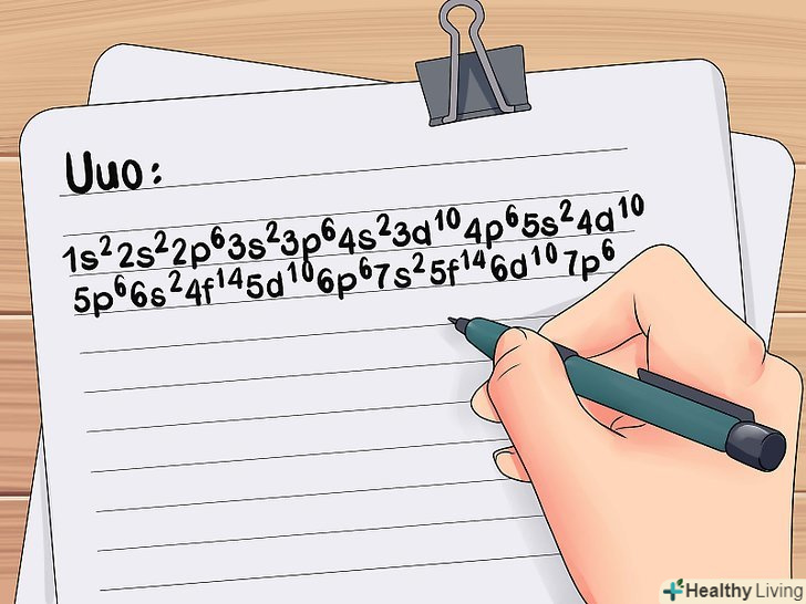 Тепер Ви знаєте, як розшифровувати електронну конфігурацію, і зможете знайти число валентних електронів певного елемента (за винятком, звичайно, перехідних металів). якщо електронна конфігурація дана в задачі, перейдіть до наступного кроку. Якщо ні, читайте далі.- Ось повна електронна конфігурація оганесона (Og; атомний номер 118):