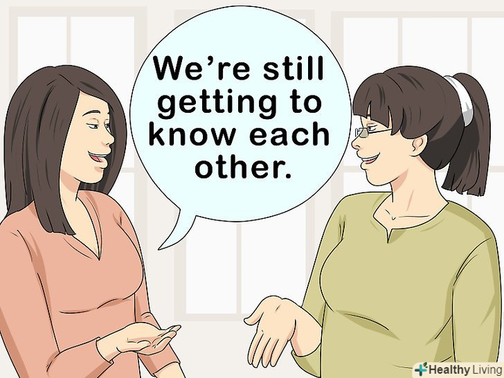 Повідомте, що ви зараз на іншій стадії відносин.партнери часто прагнуть захистити свої відносини. Для цього необов'язково піддаватися тиску. Обміркуйте такі відповіді на питання про шлюб:[2]- "Ми поки що прагнемо краще пізнати один одного".