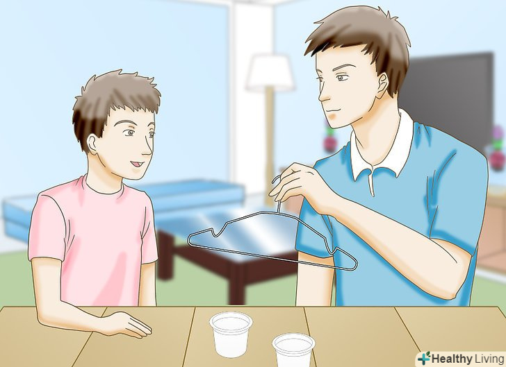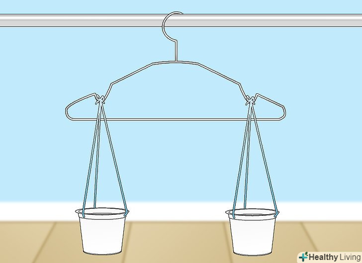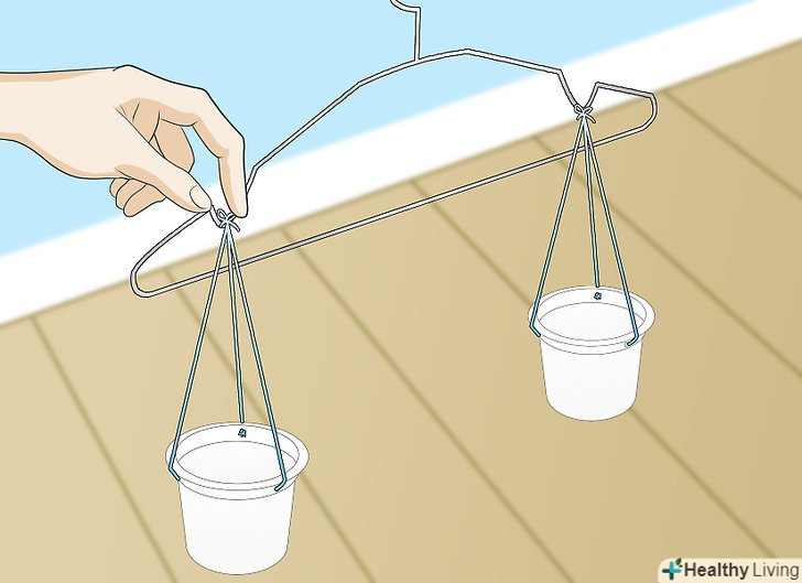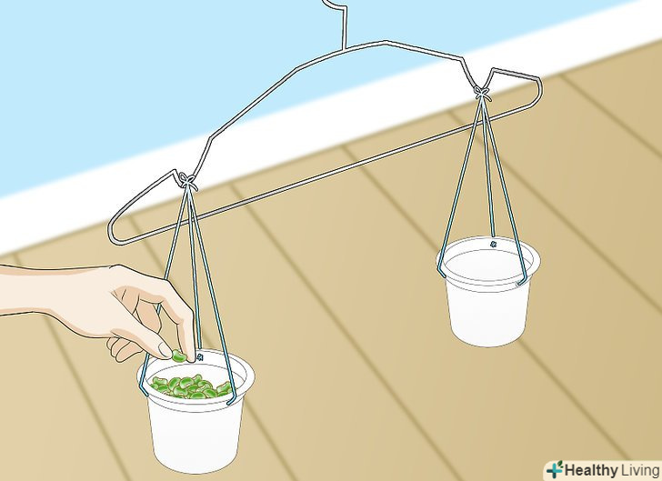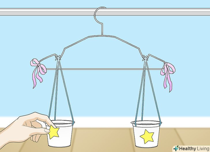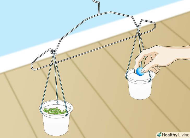 - Після того як дитина зрозуміє концепцію, можна придумати і зібрати інші ваги. Наприклад, для виготовлення настільних ваг вам знадобляться дві стаканчики, дерев'яна паличка (можна взяти пензлик), мотузка, олівець, затиск і важка книга. Підвісьте стаканчики по обидва боки палиці. Посередині палиці (перпендикулярно їй) за допомогою затиску зафіксуйте олівець. Покладіть олівець на край столу, зверху притисніть його за допомогою книги. Ці ваги будуть працювати за тим же принципом, що і ваги на базі Вішалки.[2]