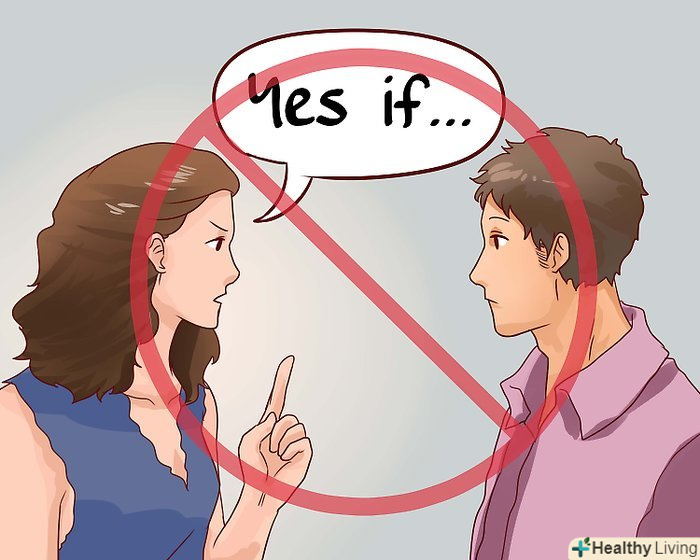 Уникайте ставити умови. говорити "я скажу "так", якщо ти... – - це не прояв любові і навіть не розумний компроміс. Через рік ви можете опинитися в точно такій же ситуації, гірко шкодуючи про те, що загнали себе в кут. Замість цього попросіть партнера дати вам час і подумайте, що змушує вас висувати ці умови. Найімовірніше, ви хочете сказати "Ні", і вам слід міняти свою відповідь на "так", тільки якщо ви щиро і всім серцем передумаєте.