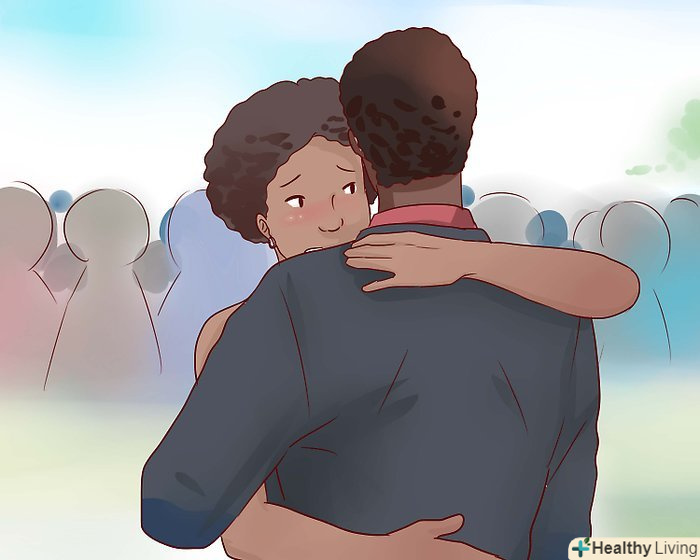 Впорайтеся з ситуацією на публіці.якщо вам зробили пропозицію в громадському місці, попросіть партнера встати (якщо потрібно) і дружньо обійміть його. Це спосіб показати, що ви зворушені його жестом, не кажучи при цьому "так". Також можна розраховувати, що ваші обійми змусять сторонніх спостерігачів втратити інтерес і повернутися до своїх справ, позбавивши тим самим вашого партнера від додаткової незручності.- Якщо оточуючі продовжують на вас дивитися, візьміть партнера за руку і запропонуйте вийти туди, де ви зможете поговорити наодинці.