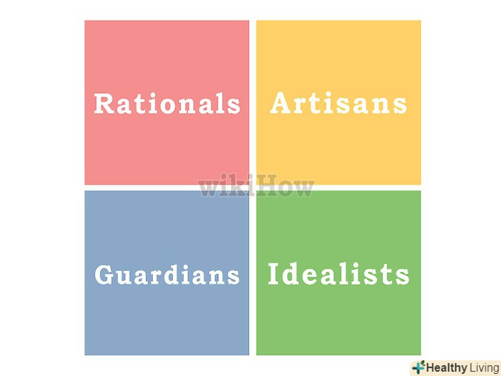 Визначте свій темперамент і тип особистості за моделлю Кейрсі (KTS®-II).типологічний опитувальник Кейрсі-це популярний онлайн-тест, і він безкоштовний. За результатами тесту ви зможете зрозуміти, який темперамент у партнера Вам підходить найбільше (припустимо, протилежний вашому типу особистості). Відповідно до типології Кейрсі, існує чотири типи людей: SP – Діонісій (землероб), SJ – Епітемей (страж), NF – Апполон (раціональна людина), NT - Прометей (ідеаліст). Кожна з цих категорій розбивається ще на 4 підкатегорії.[1]- Таким чином, є 16 наборів чотиризначних кодів (не переплутайте порядок). У кожного з 16 кодів є протилежність з числа інших 15 кодів, а решта 14 значень відрізняються від основного коду незначно.