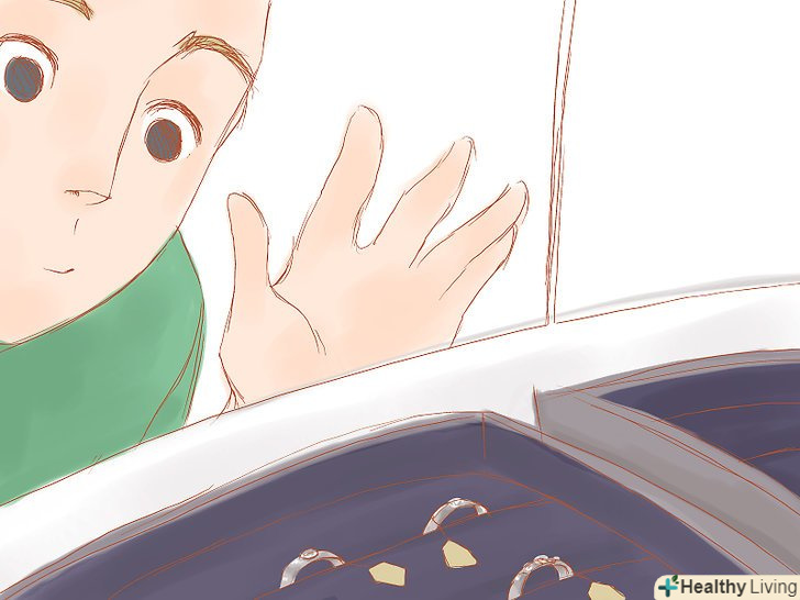 Виберіть обручку.якщо ви знаєте, які кільця подобаються вашій половинці, це просто прекрасно. Якщо ж ви не знаєте або не хочете питати, візьміть тимчасове кільце, яке вона зможе поміняти на те, що їй сподобається; для багатьох жінок це найкраще рішення. Але якщо ви знаєте напевно, яке кільце вона хоче, постарайтеся тихенько взяти кільце, яке вона носить, щоб дізнатися розмір. Вона буде зворушена, що ви запам'ятали те кільце, яке вона хотіла, та ще ви вибрали правильний розмір! Але якщо ви не уявляєте, яке кільце вона хоче, і запитайте "між справою", вона може розкусити ваші наміри.- Не варто витрачати на кільце весь свій стан, особливо, якщо ви не можете цього собі дозволити. Краще вибрати щось скромне і класичне і витратити ці гроші на спільне життя, ніж витратити всі заощадження на коштовності.