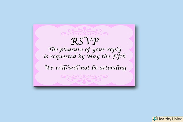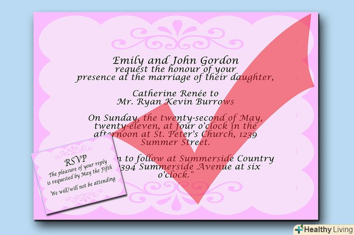Додайте прохання про відповідь на запрошення.якщо хочете, то можете окремо додати картку про прохання відповісти на запрошення або попросити гостей продзвонити вам. Те, як ви налаштовані, змусить ваших гостей відповісти вам швидше. Таким чином, ви будете точно знати їх кількість на вашому весіллі.- На завершення, ваше запрошення має виглядати приблизно так:"Емілі і Джон Гордон мають честь запросити вас на весілля їх дочки Кетрін Рене з Г. Райаном Кевіном БерроузомВ неділю, двадцять другого травня двох тисячі одинадцятого року, о четвертій годині дня в церкві Св. Петра, за адресою 1239 Саммер Стріт.Прийом гостей починається на вулиці Саммерсайд Кантрі Клаб, 2394 Саммерсайд Авеню в 6: 00."