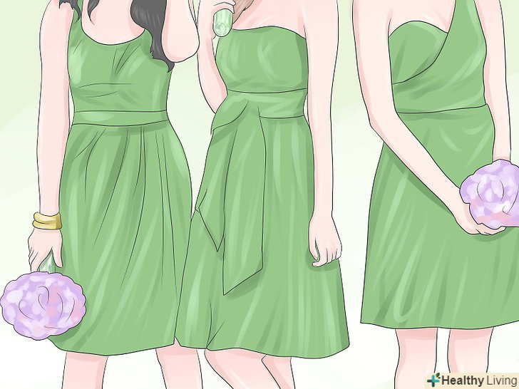 Виберіть сукні для подружок нареченої.як і у випадку з весільною сукнею, може пройти кілька місяців, поки вам їх доставлять. Можливо, в них доведеться щось перешивати. Ваші подруги можуть і не звернути уваги на ліміт часу, тому виберіть сукні, які не підкреслюють недоліки фігури, або в них є шнурівка замість блискавки. Їх можна буде трохи змінити, і це не стане проблемою, якщо Ви користуєтеся послугами хорошого кравця/швачки.- Переконайтеся, що в універмагах і весільних салонах є можливість купити готовий одяг. Візьміть з собою подруг, щоб вони змогли приміряти сукні.