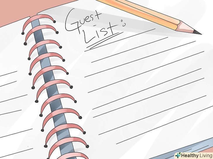 Складіть список гостей зі своїм партнером. визначте, скільки людей ви зможете прийняти з доступними вам грошима і простором. Почніть записувати їх адреси удвох. Самі розумієте, спершу у вас 5 гостей і скромна вечірка, а потім ви згадуєте про всіх родичів, знайомих, їх родичів, їх знайомих... Ну, ви розумієте. Чим раніше ви визначитеся з кількістю гостей, тим простіше вам буде планувати. Про запрошення поки що можна забути, адже цей крок слід робити тоді, коли ви знаєте, кого запросите (і кому зможете оплатити свято).