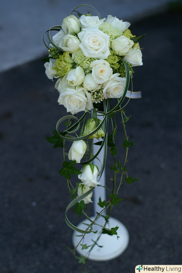 Спорудити каскадний букет.це, швидше за все, найскладніший букет, тому що він запросто може вийти однобоким, або навпаки, придушити весь інший декор. Почніть зі спеціального тримача для букетів з нахилом. Упорядкуйте квіти так, щоб вони не випадали з тримача. Довші квіти розподіліть в передній частині, а великими квітами заповніть простір перед власником букета.