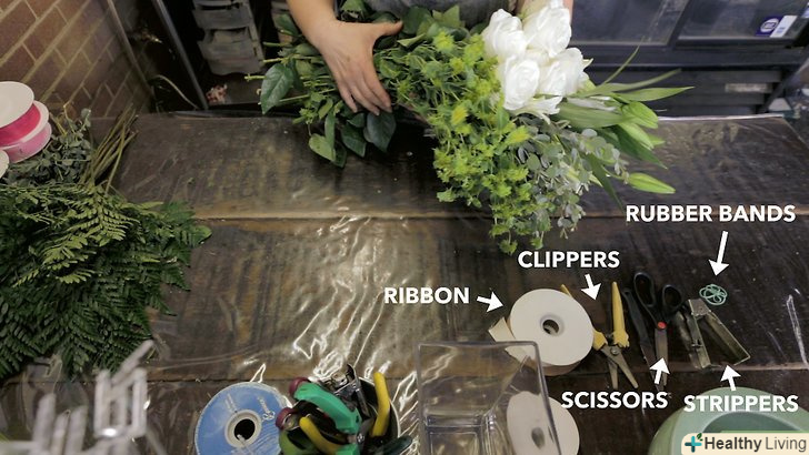 Зберіть потрібні матеріали, перед тим як почати збірку букета.- Вам знадобиться стриппер, ножиці, рафія або гумки, секатор і біла стрічка.