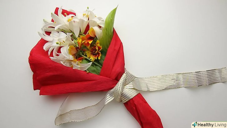- Зафіксуйте букет стрічкою або рафією.фіксуйте, відступивши близько 2,5 см під бутонами, або ж так близько, як це потрібно для щільного утримання квіток разом. Оберніть стрічку кілька разів навколо стебла, а потім відступите вниз ще 7,5-10 см.[7]