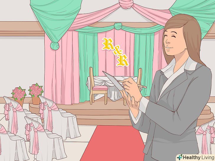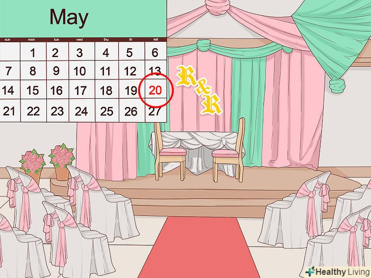 Виберіть дату та місце.вибираючи місце церемонії і прийому, враховуйте час на дорогу і невідповідність між цими двома місцями.[12] не соромтеся відвідати ті місця, які вам сподобалися. Якщо ви не впевнені, де б ви хотіли провести церемонію, в саду, в церкві або в РАГСі, подивіться всі три місця. Відвідування безкоштовні і вони можуть дати вам нову перспективу на можливі варіанти.- Перш ніж підписувати договір про місце проведення, визначте, чи буде воно відповідним для вашого списку гостей. Ресторанний зал на сто осіб може бути не найкращим місцем для скромного весілля з невеликою кількістю гостей. Крім того, запитайте з приводу послуг бару, декорування та постачання продуктів, щоб уникнути будь-яких непорозумінь або конфліктів ближче до весілля.