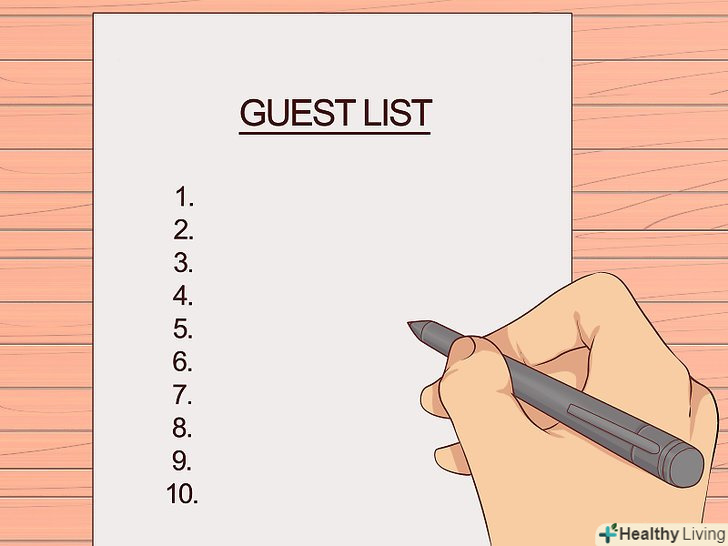 Складіть список гостей.використовуйте багаторівневу систему для визначення їх кількості. Спочатку створіть перший ряд людей, які обов'язково повинні бути на вашому весіллі. У список гостей першого ряду повинні входити близькі родичі. Потім створіть другий ряд людей, яких ви хотіли б запросити. Другий ряд повинен включати друзів і близьких колег. Третій і останній ряд-це список гостей, яких ви повинні б запросити, але це не обов'язково. Наприклад, далеких родичів і друзів сім'ї. Використовуйте перший ряд як вихідну точку для списку гостей і послідовно збільшуйте список. Краще тримайте ці списки в секреті, щоб не зачепити нічиїх почуттів.- Виберіть свідків з боку нареченого і нареченої. Вони будуть дуже важливими фігурами у ваш особливий день, і вони повинні вписуватися в список гостей. Не відчувайте себе зобов'язаними вибирати тільки з першого ряду гостей, краще вибирайте, грунтуючись на дружбі і характері людини. Якщо ваша найкраща подруга тиха і боязка, можливо, їй краще бути другою подружкою нареченої, а чарівна і комунікабельна двоюрідна сестра більше підійде на роль свідка.[11]