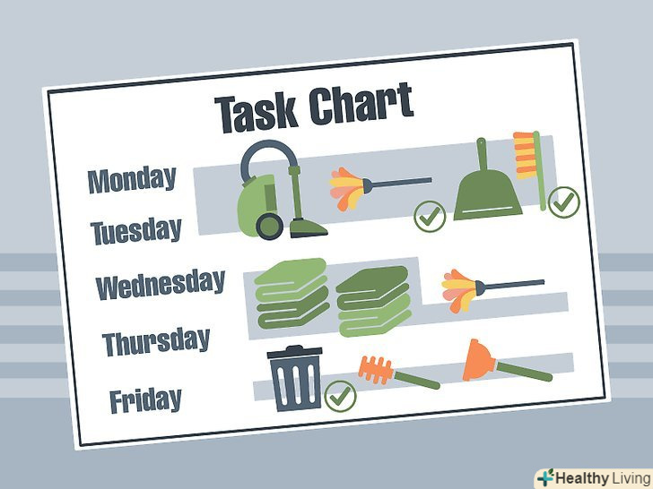 Складіть графік домашніх обов'язків.він повинен включати в себе всіх членів сім'ї, перелік днів тижня і термінів виконання. Чим більше завдання, тим більше має відводитися для неї часу, щоб виконання не було пов'язане зі стресом і поспіхом. Краще робити потроху заздалегідь, ніж в останній момент поспішати і намагатися зробити кілька справ одночасно.