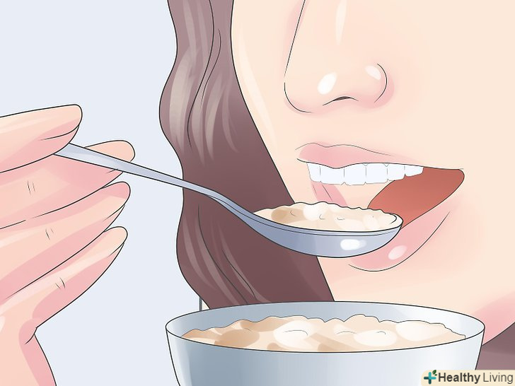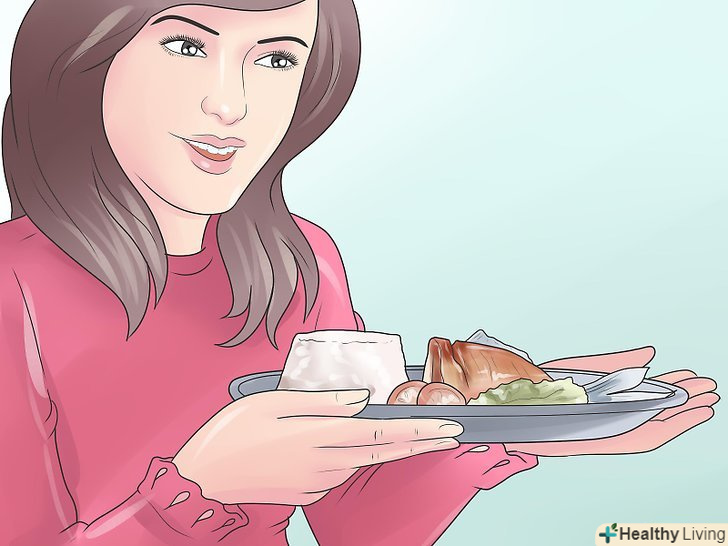 Їжте часто, але маленькими порціями.ще один спосіб схуднути-це їсти здорову їжу часто невеликими порціями і пропускати основні страви.[9] ви відчуєте себе більш енергійною, якщо будете харчуватися невеликими порціями кілька разів на день. Для молодої мами так буде навіть легше, тому що не доведеться витрачати час на повноцінний обід і вечерю.- Приклад щоденного раціону може виглядати приблизно так: тарілка вівсянки, банан і протеїновий коктейль на сніданок, трохи селери по дорозі на роботу, чашка йогурту і два тости з цільно зернового хліба в 10 ранку, сендвіч з індичкою, салатом і помідором в 12, виноград і часточки апельсина в 14, морква і стакан молока в 16, і велика порція салату з капусти і кіноа на вечерю. Їжте соєві горіхи між прийомами їжі, якщо не в змозі подолати почуття голоду!