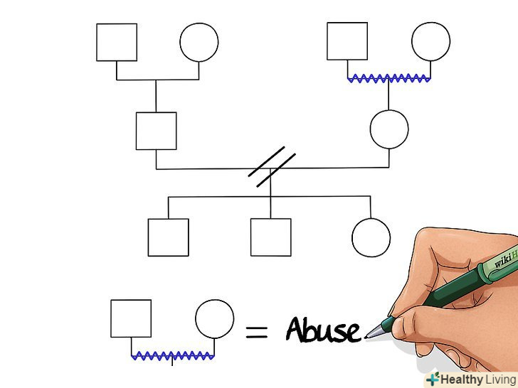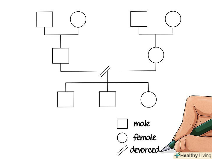 Оформіть схему на підставі сімейних зв'язків так, щоб найстаріше покоління з тих, що вас цікавить, виявилося зверху.наприклад, можна почати генограмму з бабусі і дідуся або навіть з їх батьків. Генограми демонструють різноманітність сімейних відносин, а також певні закономірності або захворювання.- В генограммах є Символи, які позначають такі взаємодії, як конфлікт, близькість, відчуження і так далі. У емоційних зв'язків є особливі значки, які роблять генограмму зрозумілою.