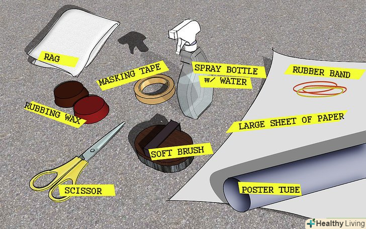 Зберіть все необхідне.вам знадобиться м'яка пензлик, ножиці, скотч, великий відрізок паперу, віск або великий олівець темного кольору, пляшечка з дистильованою водою, чиста тканина, аптечна гумка і трубка для афіш.