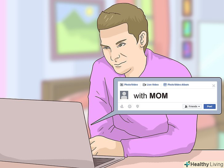 Відзначте її під постом в соціальній мережі (наприклад, Facebook).відправивши мамі повідомлення, яке зможуть побачити і прокоментувати всі її друзі, ви також зможете її підбадьорити.[4] спробуйте написати про щось, що змусить її посміхнутися, наприклад, додати смішну фотографію кота, мем про кіно, яке їй сподобалося, або просто щирий комплімент.