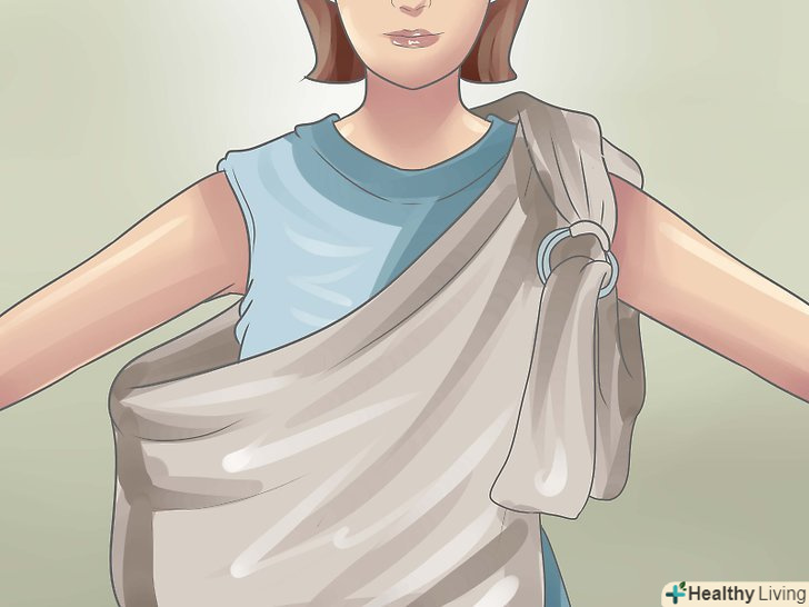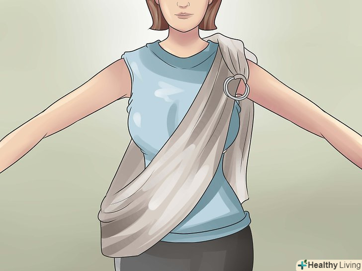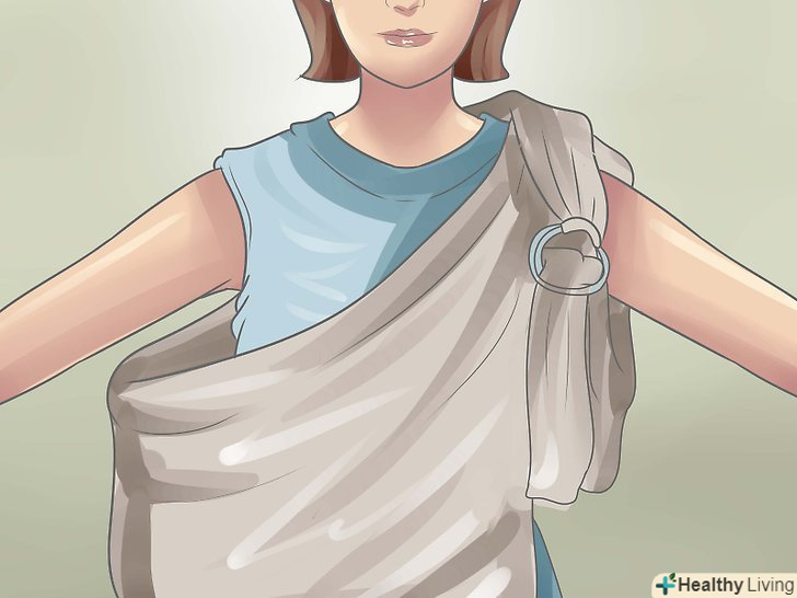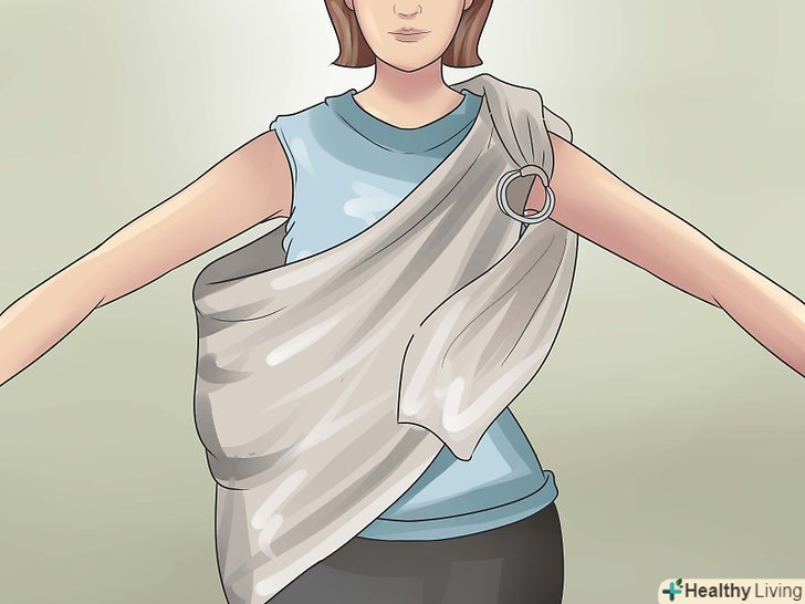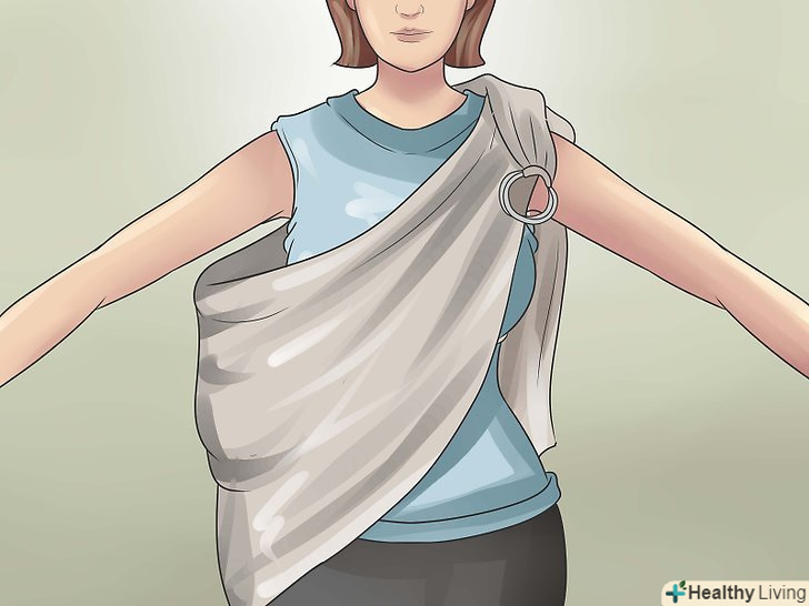 Розташуйте слінг.якщо на слінгу є кільця, процедура загортання трохи інша. Спочатку, покладіть сторону слінгу з кільцем на плече, навпроти стегна або руки, якою ви тримаєте дитину. Іншими словами, якщо ви тримаєте малюка праворуч, встановіть кільце на лівому плечі. Вільна частина слінгу без кільця повинна вільно звисати на спині.
