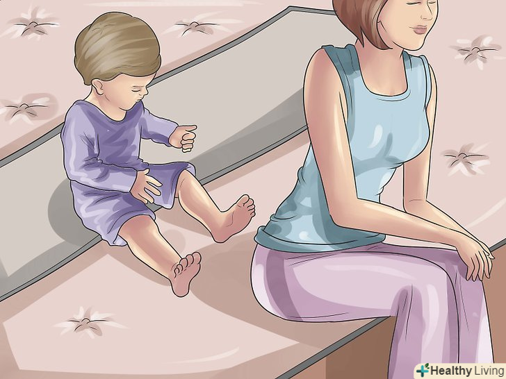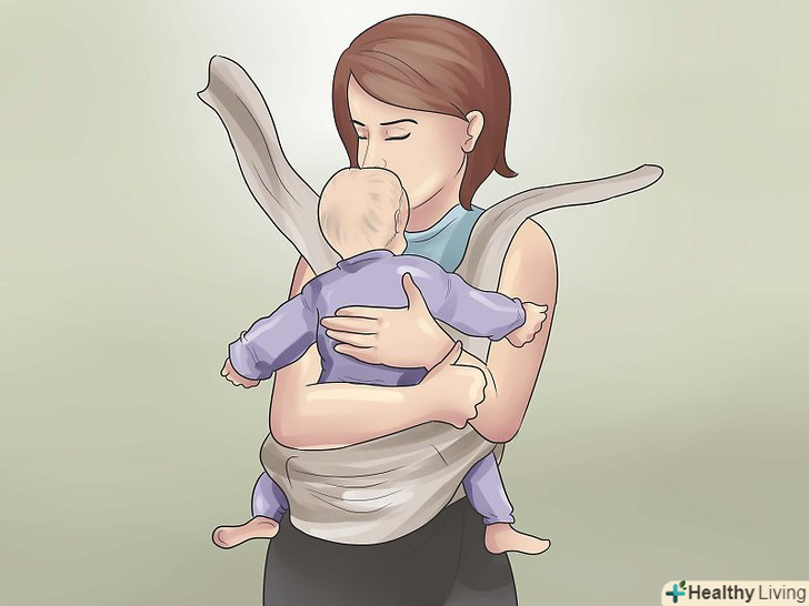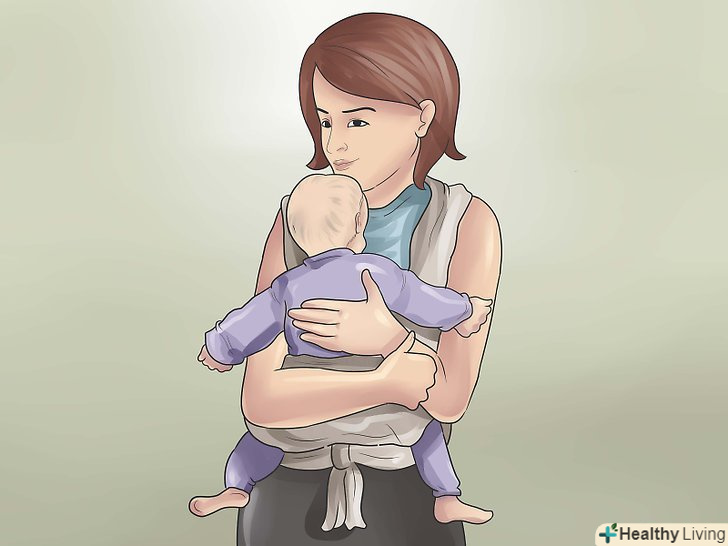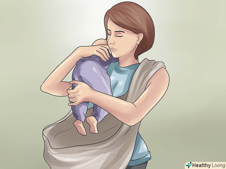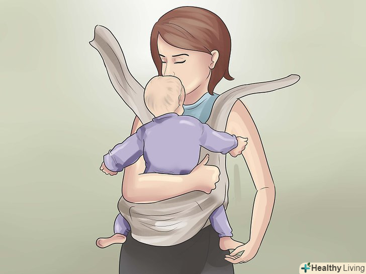 Покладіть ніжки малюка в слінг.тримайте дитину навпроти плеча, відхиліться трохи назад, і просуньте ніжки немовляти в слінг, в напрямку живота.