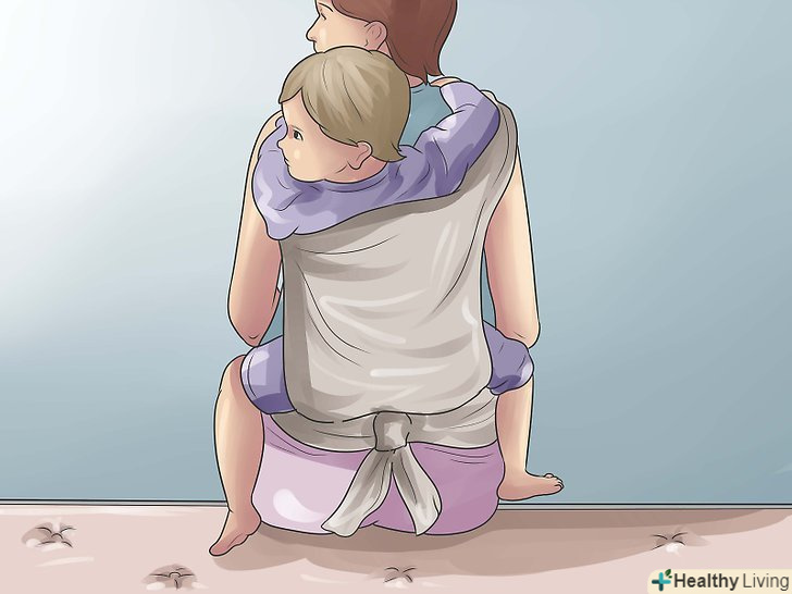 Візьміть дитину на спину.Сядьте навпроти ніг малюка, спиною до нього. Візьміть два кінці тканини і потягніть їх на себе, розташуйте дитину на спині як портфель.