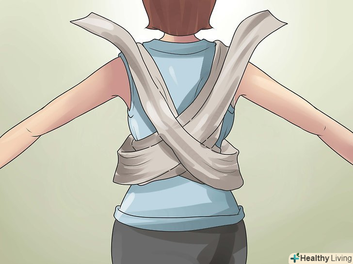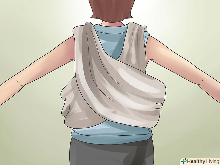 Перехрестіть слінг на спині.візьміть кінці тканини, попередньо перехрестивши на спині, так, щоб схрещені кінці звисали з плечей на груди.