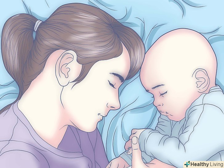 Спіть тоді, коли спить дитина.не позбавляйте себе сну, тому що інакше ви будете занадто сильно втомлюватися для того, щоб піклуватися про новонародженого. З'ясуйте, скільки годин сну в день вам достатньо, і намагайтеся висипатися, нехай і за рахунок сну уривками. Відмовтеся від спокуси відповісти на всі електронні листи, коли дитина спить - вам теж потрібен відпочинок.- Покладіть дитину на спину в ліжечко і будьте десь поруч. У ліжечку не повинно бути подушок, важких ковдр або іграшок. Можна підкласти під руки дитини тонку ковдру і подоткнуть його під ліжечко.[1]якщо ви вирішите укладати дитину в своє ліжко, почитайте статті про те, як робити це правильно. Нижче ми розповімо, в яких позах слід спати.