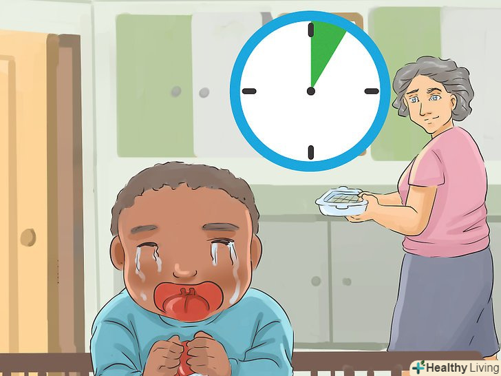 Вийдіть з кімнати і дозвольте дитині поплакати 5 хвилин.після того як покладіть дитину в ліжечко, вийдіть з кімнати. Знайте, якщо дитина буде плакати, це нормально. Дайте дитині поплакати 5 хвилин, потім поверніться в кімнату.[14]- Можна слухати під дверима або за допомогою радіоняні.