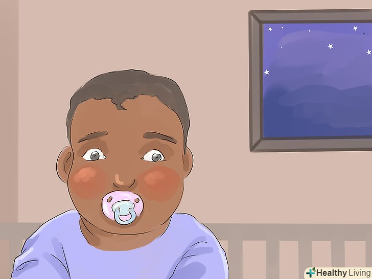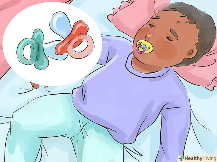 Запропонуйте дитині соску, щоб заспокоїти його.соска задовольнить потребу дитини смоктати що-небудь і допоможе йому спати безперервно довше. Крім того, соска може допомогти дитині заснути, коли ви покладете його в ліжечко. Дайте дитині соску, перш ніж покласти його спати, і допоможіть знайти її, якщо дитина прокинеться.[9]- Смоктання соски уві сні також дозволить запобігти синдрому раптової дитячої смерті.