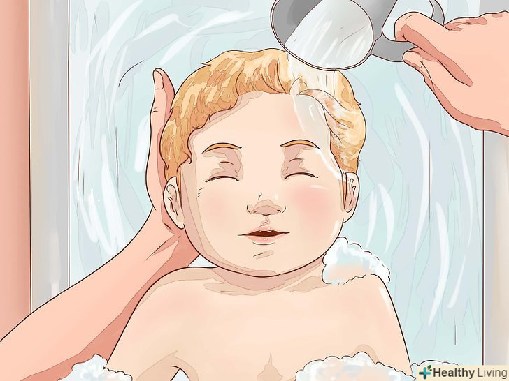Вимийте волосся.якщо необхідно вимити волосся немовляти, нахиліть його назад і м'яко помасажуйте намочені водою волосся. Полийте чистою водою з чаші на голову. Можна, за бажанням, використовувати дитячий шампунь, але, насправді, такої потреби немає. Немовлята народжуються, маючи природне масло, що очищає їх волосся, і шампуні в цьому віці можуть лише порушити баланс.- Якщо ви використовуєте дитячий шампунь, прикривайте очі дитини рукою, щоб уникнути попадання туди піни від шампуню.