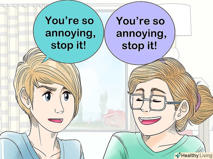 Повторюйте високим голосом все, що говорить ваш брат або сестра.якщо він або вона цікавляться, навіщо ви це робите, просто повторіть питання високим голосом. Якщо ви бачите, що ваша поведінка викликала обурення, скажіть: "Перестань Так себе вести! Не злись!"Продовжуйте повторювати слова високим тоном. Така поведінка доведе вашого родича до білого каления.[2]