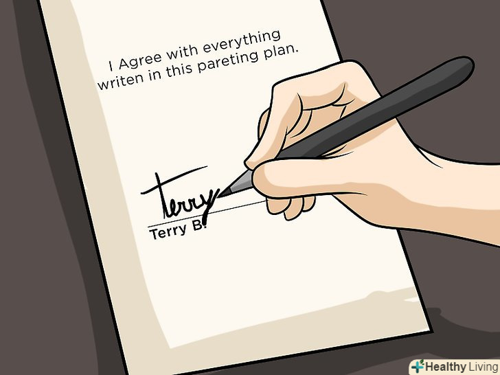 Підпишіть угоду.підписання Угоди про порядок спілкування та виховання демонструє, що ви обидва зобов'язуєтеся дотримуватися угоди, до якої Ви прийшли. Навіть, якщо ви не заповнюєте документ для суду, наявність підписів обох сторін не зашкодить.- Якщо потрібна реєстрація вашої угоди про порядок виховання в суді, то обидві підписи на документі повинні бути нотаріально завірені.[24]