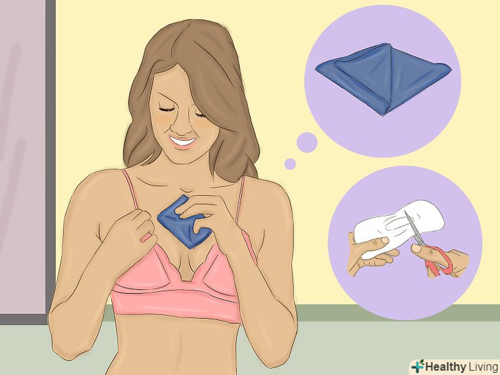 Зробіть прокладки для грудей своїми руками. більшості жінок не доведеться занадто довго використовувати прокладки для грудей. Якщо ви не хочете вкладати гроші в прокладки для грудей, зробіть їх самостійно з підручних засобів. Спорудіть прокладки одним з наступних образів:[21]- Кладіть бавовняну хустинку всередину чашок бюстгальтера