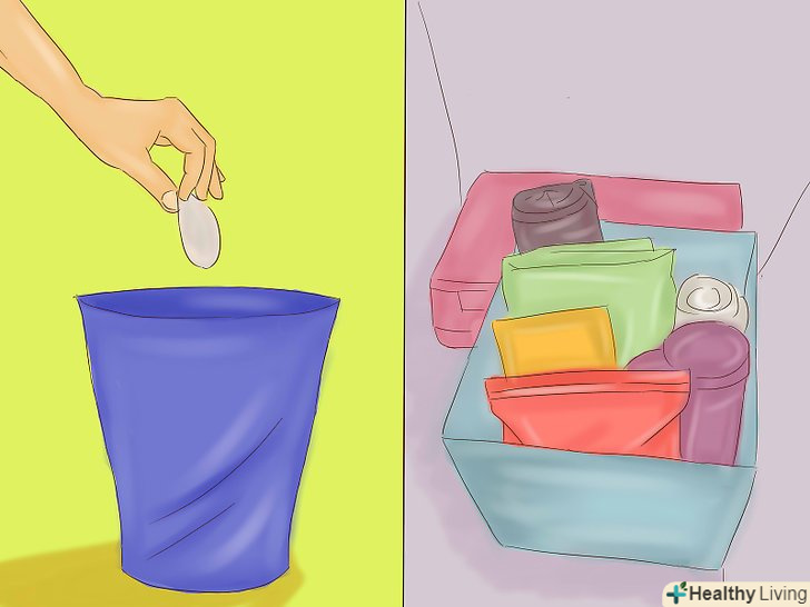 Викиньте в урну прокладки для грудей.зазвичай використані вкладиші для грудей просто викидають. Використані одноразові прокладки викиньте в сміття. Багаторазові залиште в кошику для білизни.[11]