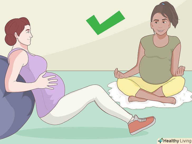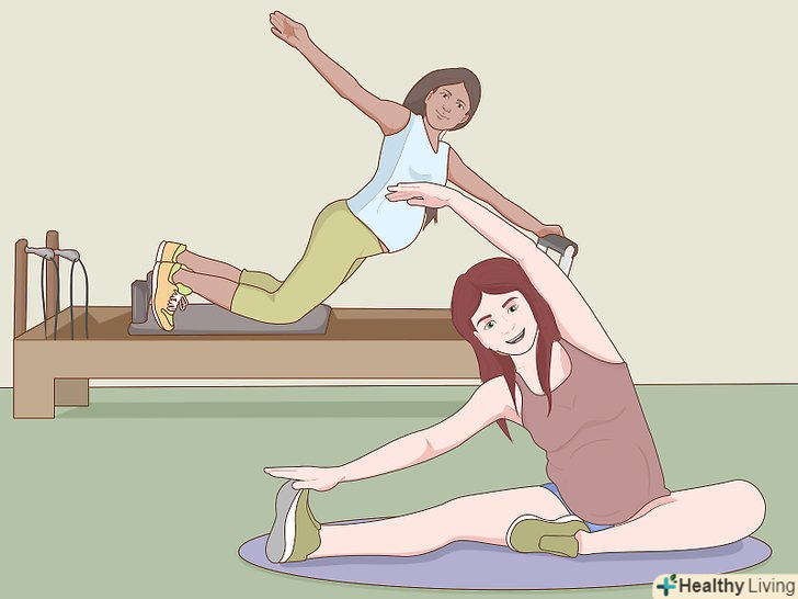 Займіться йогою або пілатесом.багатьом жінкам подобається займатися пілатесом, і щоб підтримувати форму, і щоб розуміти своє тіло. Така активність сфокусована на розтяжці і доданні тонусу м'язам.- Якщо ви збираєтеся записатися на курси в місцевому спортзалі або громадському центрі, підшукайте курс, який розроблений спеціально для вагітних. Скажіть інструктору, який у вас термін вагітності.