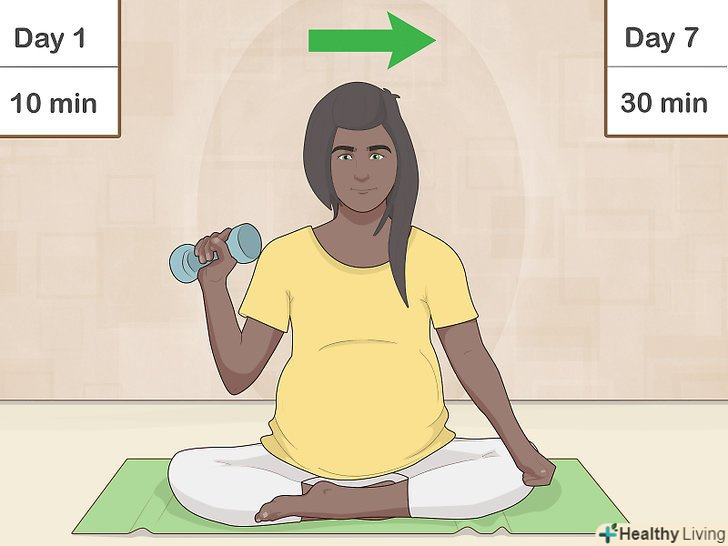 Починайте поступово.ви можете виявити, що втомлюєтеся значно швидше, ніж до вагітності. Якщо ви займалися до вагітності, то можете продовжити заняття з тією ж тривалістю, але з меншою інтенсивністю. Якщо ж ні, починайте з 5-10 хвилин тренувань в день, а потім доведіть заняття до 30 хвилин помірного навантаження.[3][4][5]- Тренування не повинні тривати занадто довго або бути надто інтенсивними. Докладайте лише таку кількість зусиль, щоб почастішало серцебиття, і кров циркулювала по тілу.