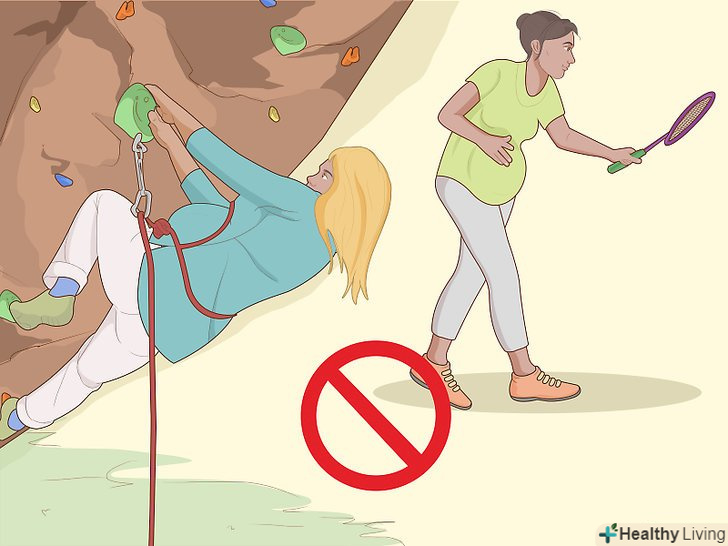 Утримайтеся від ризикованих видів спорту. це означає, Ви повинні уникати таких видів діяльності, де ви можете впасти, або вас можуть вдарити, стукнути або притиснути. Серед тих видів активності, яких слід уникати:[9][10]- Пози йоги, де вам потрібно лежати рівно на спині після 20 тижня. Це може зменшити кровопостачання у вас і вашого малюка.