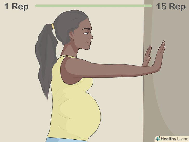 Підтримуйте силу верхньої частини тіла.є кілька видів діяльності, які приведуть ваші руки і спину в форму, щоб піднімати і тримати дитину після народження:- Віджимання від стіни. Ця вправа зміцнює ваші грудні м'язи і трицепси. Встаньте обличчям до стіни, ноги на ширині плечей. Поставте долоні на стіну на висоті плечей. Зігніть лікті і нахиляйтеся до стіни, поки не торкнетеся її носом. Відштовхніться руками і станьте рівно. Почніть з малого і поступово збільшуйте до 15 повторів.[12]