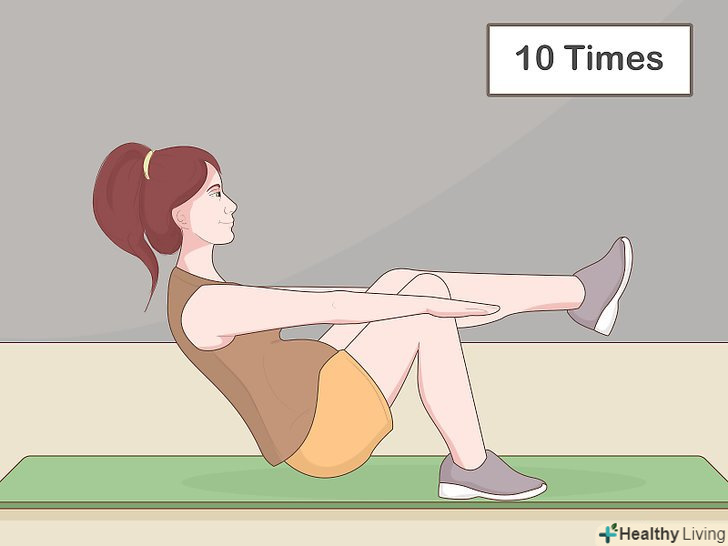 - Складка. Сядьте на тренажер-стендер або лавку для ніг, щоб Ви були на висоті близько 30 см від підлоги. Ваші ноги повинні бути зігнуті, а стопи на підлозі. Нахиліться назад, поки не відчуєте, як заробили черевні м'язи. Утримуйте положення приблизно п'ять секунд, а потім знову сядьте рівно. Виконайте 10 разів.[16] коли ви навчитеся добре це робити, можете виконувати складку, по черзі піднімаючи то одну, то іншу ногу.[17]