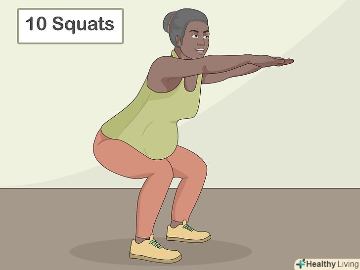 Тримайте ноги в тонусі.вправи для ніг допоможуть вам підтримувати м'язи ніг, гнучкість і рівновагу. Деякі позиції, наприклад присідання, можна робити під час потуг, щоб проштовхнути дитину в родовий канал.- Присідання. Встаньте спиною до стіни, стопи на ширині плечей. Зігніть коліна і зсковзуйте вниз по стіні, поки ваші стегна не будуть паралельні підлозі. Потім вирівняйтеся і прийміть вихідне положення. Якщо ви не можете повністю опуститися-все в порядку. Над цим можна попрацювати. Ваша мета -10 присідань.[18]