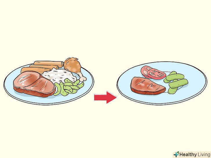Їжте часто, невеликими порціями.[7] багато невеликих порцій в день замість трьох великих порцій-тактика, яку рекомендують багато дієтологів для здійснення контролю за кількістю з'їденого. Цей метод допоможе також під час вагітності.- Відраза до їжі, нудота, печія і розлад шлунка часто не дозволяють вагітній жінці з'їсти всю порцію. Невеликі порції (5-6 порцій в день) можуть допомогти переварюванню їжі і полегшити ситуацію в цілому. Особливо це стане актуально в міру того, як дитина буде рости і здавлювати ваші органи травної системи.