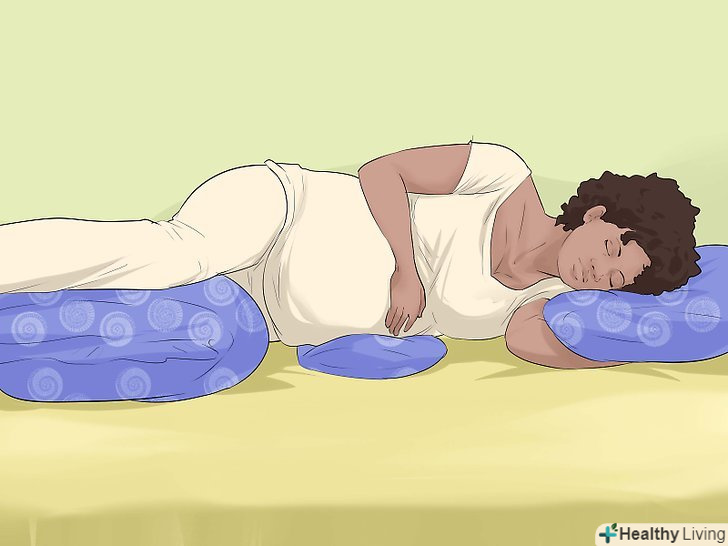 Спите на боці, використовуючи додаткові подушки. [33] зігніть одне або обидва коліна. Подушки необхідно підкласти таким чином, щоб вони зменшували біль. Покладіть досить тверду подушку під голову, а другу подушку покладіть між ніг. Також ви можете покласти маленьку подушку під живіт, щоб зменшити тиск на таз і спину під час сну.[34] багатьом вагітним жінкам подобаються довгі, що йдуть навколо всього тіла, спеціальні подушки для вагітних.- Будьте обережні, коли лягаєте і встаєте з ліжка, не напружуйте хребет.[35]