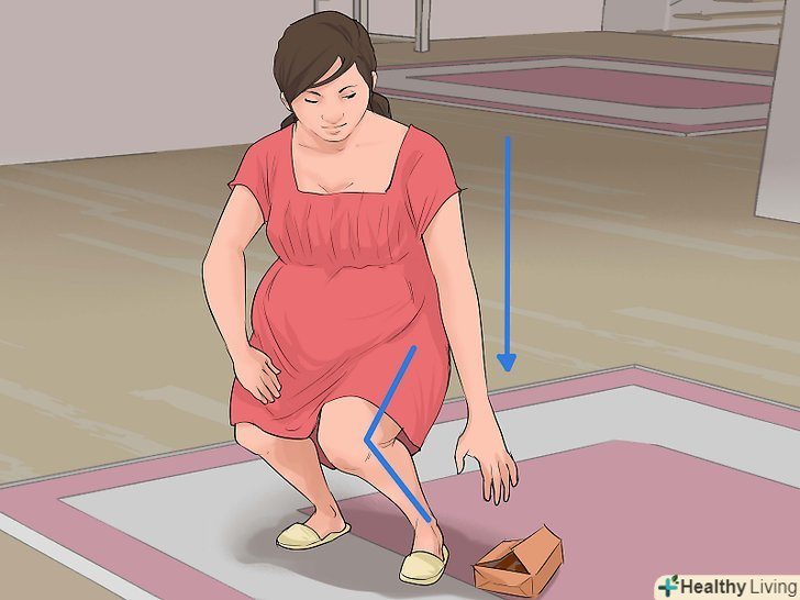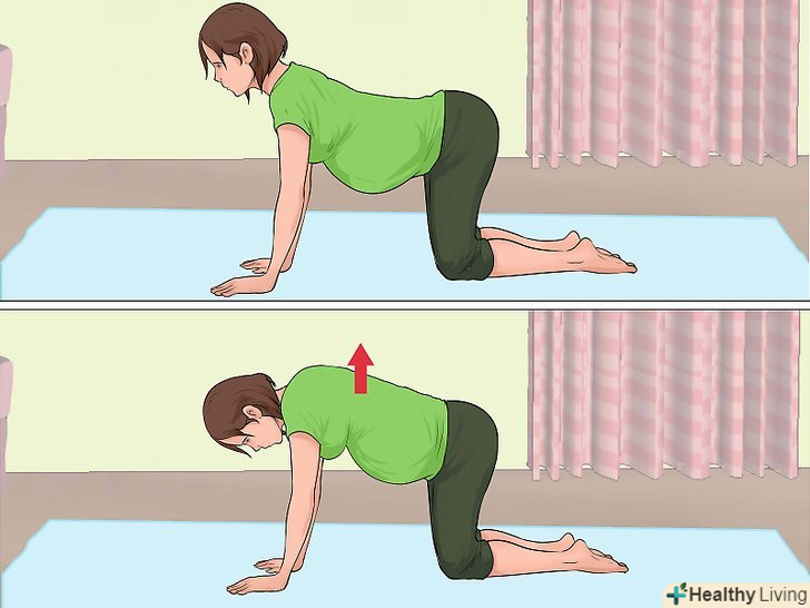 Регулярно виконуйте фізичні вправи.згідно з дослідженнями, помірні фізичні вправи при нормально протікає вагітності не пов'язані з ризиком і навіть корисні.[2] однак, якщо у вас на пізніх стадіях вагітності з'явилися болі в спині, ви повинні бути обережні при введенні нових навантажень.- Зверніть увагу на безпечні для вагітних методи зміцнення м'язів корпусу, преса і спини. Уникайте традиційних вправ на скручування і на косі м'язи живота, які можуть чинити тиск на важливі вени. Замість цього ви можете спробувати скручування або випинаючи куприка в стоячому положенні. Ви також можете спробувати діставати ліктями протилежних колін, поперемінно змінюючи боку.[3]