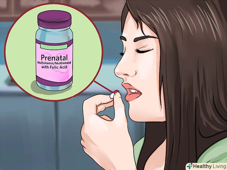 Приймайте харчові добавки.навіть якщо ви правильно харчуєтеся і отримуєте достатню кількість поживних елементів, важливо стежити за тим, щоб організм не потребував елементів, які йому особливо потрібні під час вагітності. Мультивітаміни для вагітних з вмістом фолієвої кислоти від 0,4 до 0,8 міліграмів дозволяють запобігти такі дефекти розвитку, як розщеплення хребта і аненцефалія.[11]