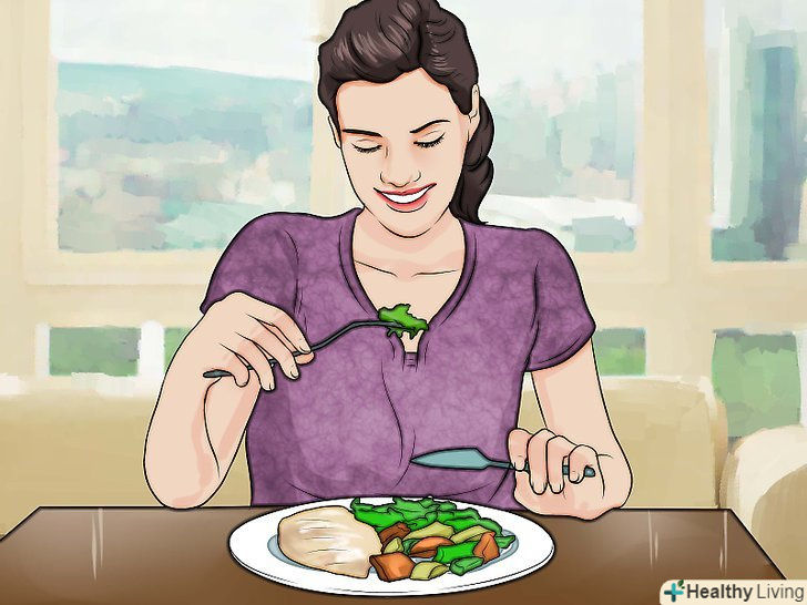 Почніть або продовжуйте харчуватися правильно.протягом всієї вагітності важливо добре харчуватися і отримувати достатню кількість калорій з корисної їжі. Це необхідно для вашого здоров'я і здоров'я дитини. Щоб отримувати всі потрібні поживні елементи з їжі в першому триместрі:[8]- Їжте поживну їжу невеликими порціями, але частіше, а не великі порції три рази на день.Це дозволить підтримувати рівень цукру в крові на одному рівні і менше втомлюватися.