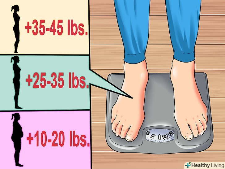 Знайте, скільки ваги ви можете набрати.у перший триместр у вас може виникати сильна тяга до певних продуктів, але вагітність — не привід їсти все, що хочеться, і в будь-який час. Важливо стежити за кількістю калорій в раціоні, оскільки в ході недавніх досліджень було встановлено, що зайва вага матері може негативно позначатися на здоров'ї дитини протягом його життя.[9] хоча все індивідуально, загальні рекомендації виглядають так:[10]- Слід з'їдати не більше, ніж 300 додаткових калорій в день, і ці калорії важливо отримувати з корисних продуктів.