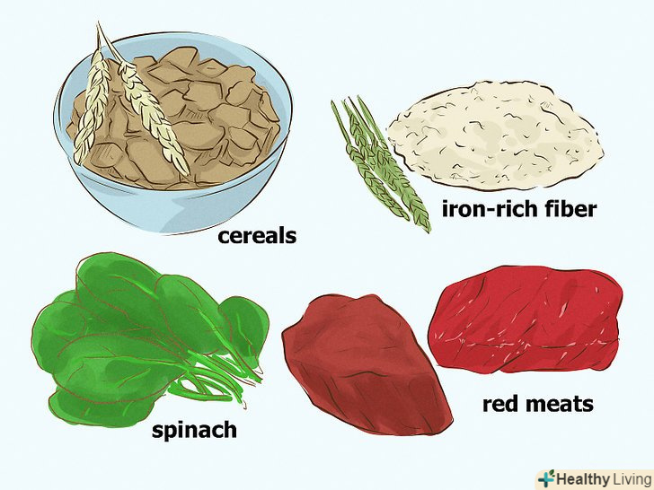 Переконайтеся, що ви споживаєте достатньо заліза.залізо необхідне організму для вироблення клітин крові, як Вашому, так і вашого плоду. Більшість пренатальних добавок містять залізо, але, як і для більшості поживних речовин, найкраще вживати залізо в натуральній формі, що міститься в продуктах, а не в складі добавок.[15]- Багаті залізом червоне м'ясо, шпинат, збагачені залізом цільні злаки (наприклад, цільнозерновий хліб і каші). Постарайтеся щодня з'їдати хоча б одну порцію таких багатих залізом продуктів.