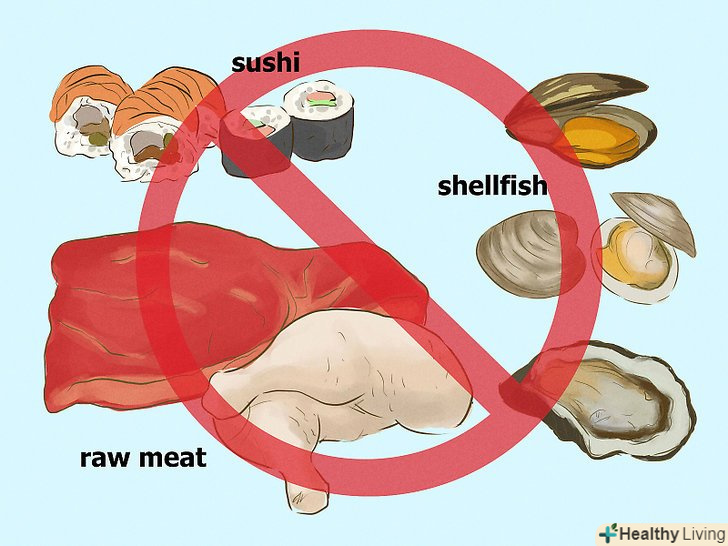 Намагайтеся не вживати сирі або напівприготовані продукти.деякі захворювання харчового походження, включаючи токсоплазмоз і лістеріоз, часто зустрічаються в сирому і напівсирому м'ясі. Дані захворювання можуть бути досить небезпечними для плоду, що розвивається, тому краще уникати тих продуктів, які можуть їх містити.[20]- Постарайтеся не їсти молюсків, сиру рибу (наприклад, суші або сашимі), сире або в'ялене м'ясо і сирі яйця.