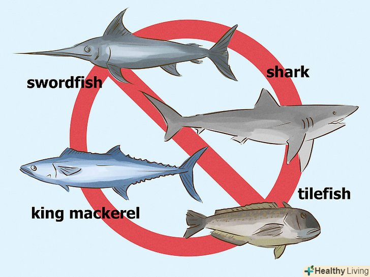 Не їжте рибу, яка накопичує ртуть.важкі метали, такі як ртуть і свинець, неймовірно шкідливі для плода і навіть можуть викликати смерть в досить великих кількостях. У деяких видах риби особливо високий вміст ртуті, що робить їх небезпечними для вживання під час вагітності. До них відносяться риба-меч, акула, королівська макрель, тунець і кахельник. Проте риба, така як консервований тунець, сьомга, палтус і тріска, безпечні для вживання при вагітності.[21]- Під час вагітності скорочуйте споживання будь — яких видів риби — навіть безпечних-до одного або двох разів на тиждень.