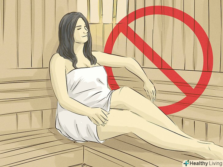 Постарайтеся не відвідувати сауни, лазні або парні.підвищення температури тіла до дуже високих позначок може бути небезпечним для плода, дослідження показують взаємозв'язок високої температури тіла з відхиленнями в розвитку і вадами. Хоча теплий душ і ванни цілком допустимі, але проводження більш довгого часу в занадто жарких умовах може викликати серйозні проблеми, особливо в першому триместрі.[26]- Уникайте будь-яких місць, де температура досягає вище 38 градусів Цельсія, а якщо ви змушені там перебувати, обмежте час свого перебування 10 хвилинами і не більше.