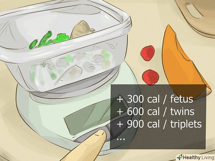 Намагайтеся їсти більше здорової їжі.гарне харчування знижує ризик проблем зі здоров'ям у вас і у малюка.[8] Фраза "є за двох" малює в уяві образи величезних тарілок з їжею і множинні прийоми їжі протягом дня. Але насправді під час вагітності потрібно вживати більше лише на 300 калорій в день.[9]- Якщо ви вагітні однією дитиною, ви повинні з'їдати 300 зайвих калорій, якщо близнюками — 600 зайвих калорій, а при трійнятах — з'їдати Додаткові 900 калорій в день.
